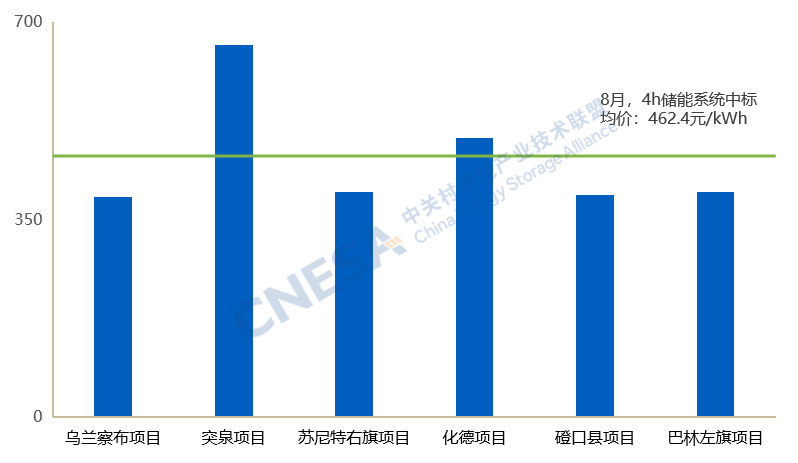 尽管8月份储能系统中标均价环比7月有所上升,但当月仍出现了几个价格较低的项目引发行业关注,成为当月中标市场的热点。月初,中能建25GWh磷酸铁锂储能系统集采中标候选人公示,其中,4h储能系统平均入围报价419元/kWh,最低报价370元/kWh,刷新行业新低。随后,内蒙古相继发布了多个GWh级相继开标和发布中标结果,普遍低于当月均价水平,从中标结果来看,仅有两个项目的中标价格高于8月份中标均价水平。