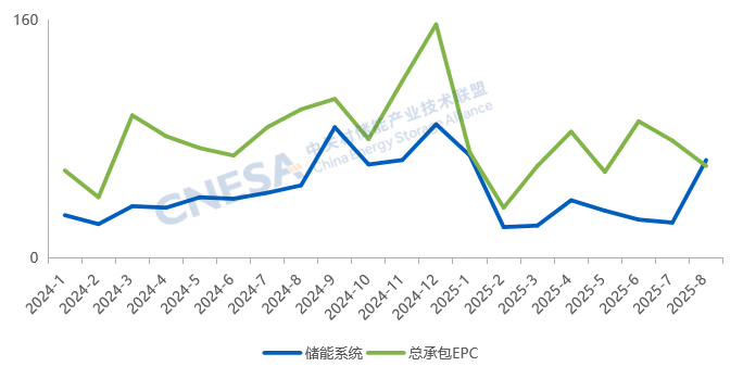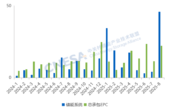 图2:2024年1月-2025年8月储能系统和EPC的中标规模情况(单位:GWh)