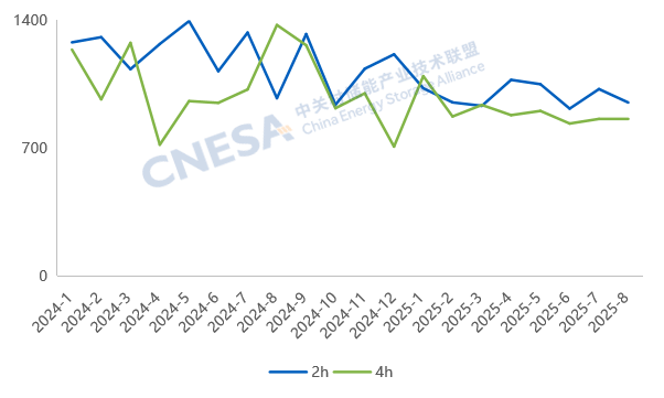 2h EPC,均价949.8.8元/kWh,同比-2.44%,环比-7.2%,价格区间为682.5元/kWh-1455.5元/kWh;