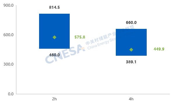 4h储能系统,均价462.4元/kWh,同比-27%,环比+12%,价格区间为389.1元/kWh-660元/kWh。